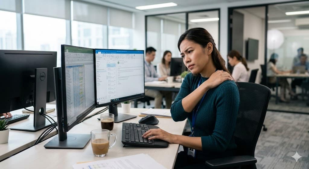 Pegal leher/pundak/punggung sering bukan karena kamu kurang olahraga saja, tapi karena terlalu menunduk saat rutinitas pekerjaan seperti monitor terlalu rendah, duduk terlalu lama tanpa jeda, posisi bahu maju dan kepala condong ke depan